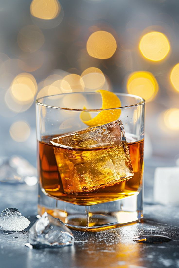 Voeg whisky en ijs toe, roer langzaam.